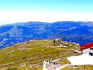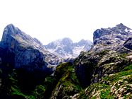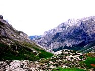 Whilst all this was going on we drove to the Fuente de cable car and were whisked up to 1,800m, where we found three types of vultures, lots of Alpine Choughs (Pic. 15) and plenty of sunshine at last. There are basically two routes upwards from the top station. The first leads towards the Torre de los Horcados Rojas (2503m), which is just doable in a day, if you get the first cable up (Pic. 16). Sadly, this is not until 10:00am and the last one down is at 6:00pm leaving little margin for error. A good thing to do, after all the earlier failures, but still no nearer to Naranja de Bulnes. Next trip up we went the other way (Pic. 17) and over to the Hotel Aliva, accessible by a long walk or a battered hotel minibus. Whatever, it has no business there in the first place. There followed a long, long drag back up hill, on a small path that sometimes wasn’t really there, minor detours round cows, wild ponies, carpets of flowers and crags to get back to the cable car. The big bonus, and completely unexpected, was a distant view of the Naranja (Pic 18 but you might have to zoom in a bit) poking up beyond a col. Success …. Well, sort of.