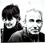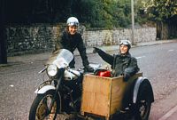 Motorbike. Rod Brown and I leaving the Alpha doss on Crookesmoor Rd en-route for Wales.